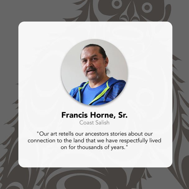 The "Woven Blanket - Harmony" by Francis Horne, Sr., combines comfort with Indigenous artistry. Made of 100% acrylic and measuring 60" x 80", this soft blanket features Coast Salish designs, making it a versatile piece for home or ceremonies. Each blanket is thoughtfully packaged with a ribbon, ready to be given as a gift. Crafted with care in Canada and reflecting deep cultural ancestry.